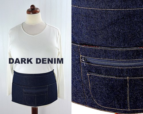 Unisex DENIM multi-pocket half apron is perfect for servers to keep all of your supplies right at your fingertips. Also great if you are teaching, sewing, crafting, gardening, organizing an event, hosting a party, or having a garage sale!!! Wonderfully full of organizer pockets for photographers or wedding planners. Works great for servers or vendors to hold your receipt book, business cards, pen, cell phone, money.... while keeping your hands free. The apron is made using sturdy 8 oz. denim fabric for the front of the apron, and each section is fully lined with high-quality cotton fabric. The durable apron features 3 large open pockets to hold your tools of the trade-- PLUS the center open pocket also contains an additional zipper compartment. This handy apron also includes a smaller patch pocket at the bottom-- divided into 2 sections perfect for holding your business cards or small gadgets--whatever! (6 pockets in all.) A large central open pocket is wide enough to hold (upright) a Kindle or iPad. Great for restaurant hostesses, servers, or teachers who utilize these devices when performing their duties. As always, my aprons are made with great attention to detail. There are no exposed seams or raw edges showing for a much sturdier and longer-lasting product. Every section is fully lined, and all seams are neatly topstitched.