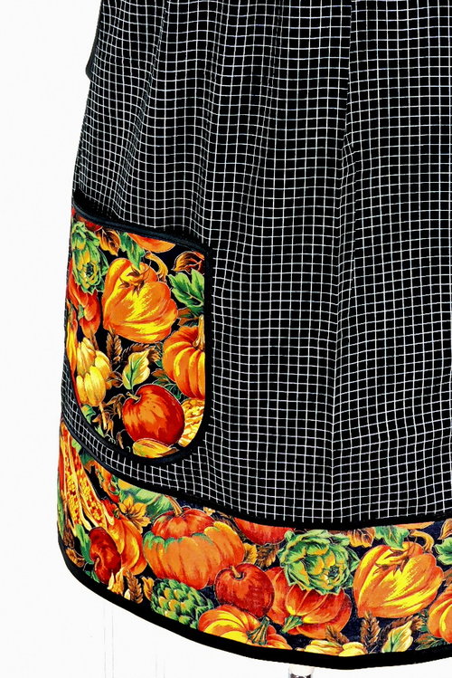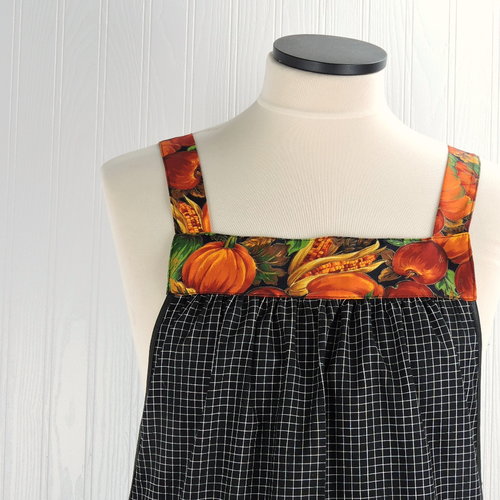 This lovely retro apron features a beautiful fall harvest print fabric and is the LAST one that can be made with these out-of-print fabrics. The Pinafore is designed to be easy to put on and take off-- with no ties, buttons, or fasteners of any kind. Simply slip the apron over your head like a t-shirt and slide your arms into the generous openings to put it on. The apron rests totally on the shoulders, placing no strain on the neck. Super comfortable for all-day wear! Apron fully covers your clothing for protection while you are working around the house, but is completely split up the back (to the band at the top) to allow freedom of movement. Armholes are bound with a coordinating bias binding for extra strength and durability. Extra-large patch pockets are so handy for many purposes. The apron is gathered in front and back where it attaches to the top bands and fits many sizes due to its unique design. Loose-fitting and very comfortable style to wear. Great care and attention are paid when making these aprons-- no exposed seams or raw edges are showing on my aprons! All seams are neatly enclosed for a sturdier and longer-lasting finished product. Makes a great gift for the cooking/baking enthusiast on your gift list-- or for a very special little treat for yourself! It would be lovely to wear while hosting fall gatherings or for your Thanksgiving feast! Many of my customers wear this apron as a pinafore over a t-shirt and leggings since they don't cook.