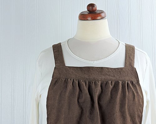 Washed 100% Flax Linen Pinafore Apron made in BROWN colored linen. Now the most popular apron design in my shop is available in this fun, easy-care fabric. Washed linen is so versatile, carefree, and livable that you will love wearing it...The more you wear it and wash it, the softer it gets...and no need to iron...Just wash, dry, and go... Part of the charm of linen is the casual rumpled appearance! This style of apron is designed to be so easy to put on and take off-- with no ties, buttons, or fasteners of any kind. Simply slip the apron over your head like a t-shirt and slide your arms into the generous openings to put it on. The apron rests totally on the shoulders, placing no strain on the neck. Super comfortable for all-day wear! Apron fully covers your clothing for protection while you are working around the house, but is completely split up the back (to the band at the top) to allow freedom of movement. Extra large patch pockets are double stitched to the apron for strength-- and they're so handy for many purposes. The apron is gathered in front and back where it attaches to the top bands and fits many sizes due to its unique design. Many of my customers wear this apron as a pinafore top over a t-shirt and leggings since they don't cook. Great care and attention are paid when I make these aprons-- there are no exposed seams or raw edges showing on my aprons! All raw edges & seams are neatly enclosed for a sturdier and longer-lasting finished product.