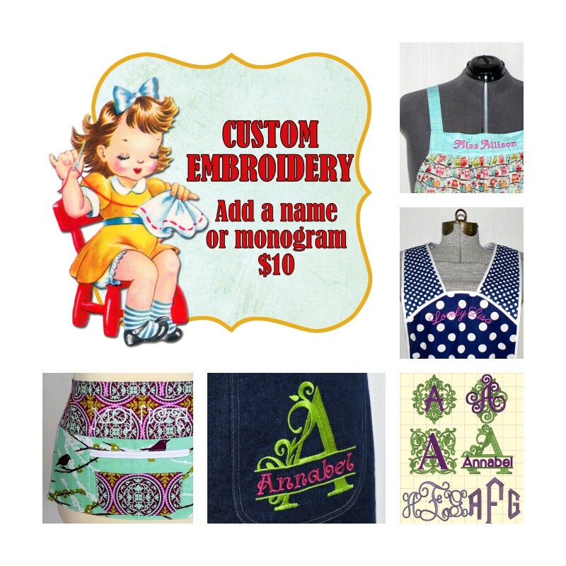 This personalization is only available for items purchased from my website. (I do the embroidery before garment construction so that the backside of the embroidery is inside the apron layers.) This service, offered at this price, is an optional perk for my customers. Custom embroidery services are not available for items purchased elsewhere. Thank you for your understanding.