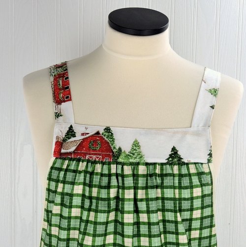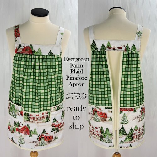 This charming Pinafore Apron is designed to be so easy to put on and take off using no ties, buttons, or fasteners of any kind. No gymnastics are required to don the apron! Comfortable apron slips over your head like a t-shirt, then slide your arms into the generous openings to put it on with ease. The apron rests totally on the shoulders, placing no strain on the neck. Extremely comfortable for all-day wear! Apron fully covers your clothing for protection while you are working around the house, but is completely split up the back (to the band at the top) to allow freedom of movement. This apron was made using fabrics from the Evergreen Farm Collection By Susan Winget For Wilmington Prints. (Now out of print-- I'm down to the last scraps of this fabric.) Armholes are bound with a coordinating bias binding for extra strength and durability. Extra-large patch pockets are so handy for many purposes. The apron is gathered in front and back where it attaches at the top bands and fits many sizes due to its unique style-- certainly roomy enough for many plus sizes. Also great for expectant moms! (The apron is shown above on my size 2X dress form.) Loose-fitting and very comfortable style to wear. Makes a great gift for the cooking/baking enthusiast on your gift list-- or for a very special treat for yourself! Great care and attention are paid when I make these aprons-- there are no exposed seams or raw edges showing on my aprons! All seams are neatly enclosed for a sturdier and longer-lasting finished product.