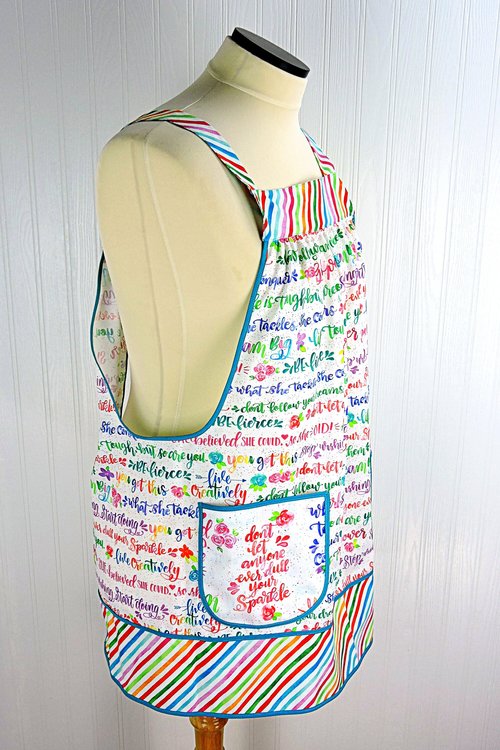 The perennial favorite Pinafore Apron was designed to be easy to put on and take off using no ties, buttons, or fasteners of any kind. No gymnastics are required to don the apron! Simply slip the apron over your head like a t-shirt and slide your arms into the generous openings to put it on. The apron rests totally on the shoulders, placing no strain on the neck. Apron fully covers your clothing for protection while you are working around the house, but is completely split up the back (to the band at the top) to allow freedom of movement. This version includes fabric featuring encouraging words of empowerment in rainbow colors, from the Girl Power 2 collection from Robert Kaufman fabrics. Great care and attention are paid when I make these aprons-- there are no exposed seams or raw edges showing on my aprons! All seams are neatly enclosed for a sturdier and longer-lasting finished product. Armholes are bound with a coordinating bias binding for extra strength and durability. Extra-large patch pockets are so handy for many purposes. The apron is gathered in front and back where it attaches to the top bands and fits many sizes due to its unique design. (Standard size apron is shown above on a SIZE 16 dress form.) It makes a great hostess gift, or a unique gift for the cooking/baking enthusiast on your gift list-- or for a very special treat for yourself! Many customers wear this apron as a pinafore top over a t-shirt and leggings since they don't cook! I do not keep an inventory. This apron is not sewn until after order confirmation. The apron in photos is the original sample sewn to take listing photos. As with any handmade creation, fabric design placement will vary from apron to apron.