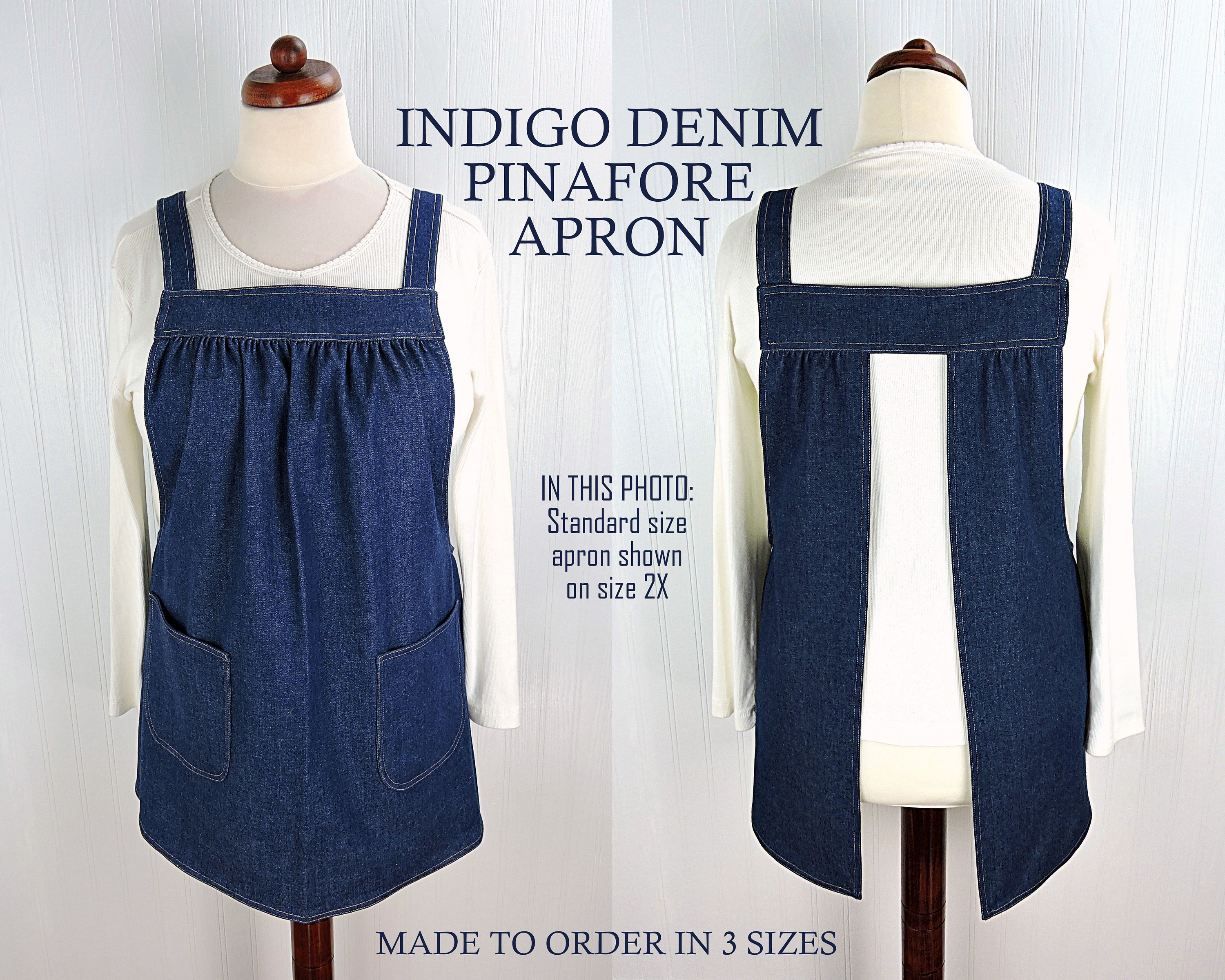 Indigo Denim Pinafore Apron: Now the most popular apron design in my shop is available in this fun, easy-care 100% cotton fabric. The medium-weight (8 oz.) denim fabric has been machine washed and machine dried (many times) by Laurie for extra softness & to pre-shrink the fibers. Denim is so versatile, carefree, and livable, you will love wearing it...The more you wear it and wash it, the softer it gets...and no need to iron...Just wash, dry, and go... This style of apron is designed to be so easy to put on and take off-- with no ties, buttons, or fasteners of any kind-- originally created for a friend with limited mobility. Simply slip the apron over your head like a t-shirt and slide your arms into the generous openings to put it on. The apron rests totally on the shoulders, placing no strain on the neck. Super comfortable for all-day wear! Apron fully covers your clothing for protection while you are working around the house, but is completely split up the back (to the band at the top) to allow freedom of movement. Extra-large patch pockets are so handy for many purposes. The apron is gathered in front and back where it attaches at the top bands and fits many sizes due to its unique design. Loose-fitting and very comfortable style to wear. Wonderful for artists to cover & protect their clothing while creating! Makes a great gift for the cooking/baking enthusiast on your gift list-- or for a very special little treat for yourself! Many of my customers wear this apron as a pinafore top over a t-shirt and leggings since they don't cook. Great care and attention are paid when I make these aprons-- there are no exposed seams or raw edges showing on my aprons! All raw edges & seams are neatly enclosed for a sturdier and longer-lasting finished product. All edges have been double topstitched with a gold thread just like your favorite pair of blue jeans.
