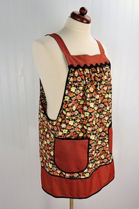 Lovely retro apron which is designed to be easy to put on and take off-- with no ties, buttons, or fasteners of any kind. Simply slip the apron over your head like a t-shirt and slide your arms into the generous openings to put it on. Mariposa Poppies Pinafore Apron rests totally on the shoulders, placing no strain on the neck. Super comfortable for all-day wear! Apron fully covers your clothing for protection while you are working around the house, but is completely split up the back (to the band at the top) to allow freedom of movement. Armholes are bound with a coordinating bias binding for extra strength and durability. Extra large patch pockets are so handy for many purposes. The apron is gathered in front and back where it attaches to the top bands and fits many sizes due to its unique design. Loose fitting and very comfortable style to wear. Great care and attention are paid when I make these aprons-- there are no exposed seams or raw edges showing on my aprons! All seams are neatly enclosed for a sturdier and longer-lasting finished product. Makes a great gift for the cooking/baking enthusiast on your gift list-- or for a very special little treat for yourself! Would be lovely to wear while hosting fall gatherings or for your Thanksgiving feast! Many of my customers wear this apron as a pinafore over a t-shirt and leggings since they don't cook.