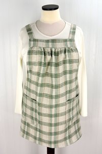 Rustic Pinafore Apron is made using 100% European linen fabric featuring neutral colors of oatmeal, sage green, and tan. The plaid design is woven (not printed) using colored linen threads (including slubs.) Now the most popular apron design in my shop is available in this fun, easy-care fabric. Washed linen is so versatile, carefree, and livable, you will love wearing it... The more you wear it and wash it, the softer it gets...and no need to iron...Just wash, dry, and go... Part of the charm of linen is the casual rumpled appearance! This style of apron is designed to be so easy to put on and take off-- with no ties, buttons, or fasteners of any kind. Simply slip the apron over your head like a t-shirt and slide your arms into the generous openings to put it on. The apron rests totally on the shoulders, placing no strain on the neck. Super comfortable for all-day wear! Apron fully covers your clothing for protection while you are working around the house, but is completely split up the back (to the band at the top) to allow freedom of movement. Extra-large patch pockets are double stitched to the apron for strength-- and they're so handy for many purposes. The apron is gathered in front and back where it attaches at the top bands and fits many sizes due to its unique design. Many of my customers wear this apron as a pinafore top over a t-shirt and leggings since they don't cook. Great care and attention are paid when I make these aprons-- there are no exposed seams or raw edges showing on my aprons! All raw edges & seams are neatly enclosed for a sturdier and longer-lasting finished product.