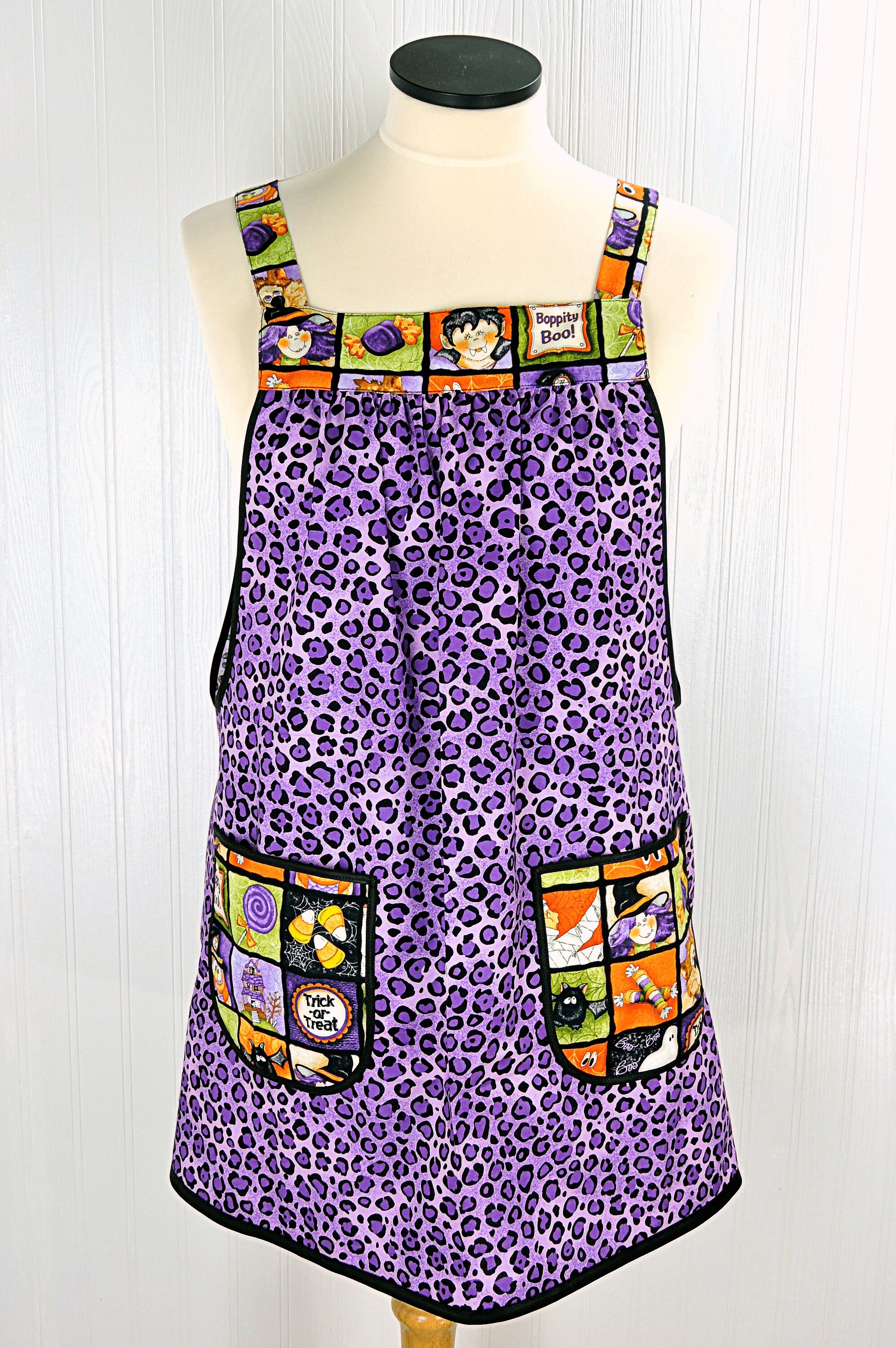 SHIPS FAST!!! Purple leopard print is combined with a colorful Halloween pattern to create a unique pinafore. The apron is specially designed to be easy to put on and take off using no ties, buttons, or fasteners of any kind. No gymnastics are required to don the apron! Simply slip the apron over your head like a t-shirt and slide your arms into the generous openings to put it on. The apron rests totally on the shoulders, placing no strain on the neck. Super comfortable for all-day wear! Apron fully covers your clothing for protection while you are working around the house, but is completely split up the back (to the band at the top) to allow freedom of movement. Armholes are bound with a coordinating bias binding for extra strength and durability. Extra-large patch pockets are so handy for many purposes. Great care and attention are paid when making these aprons-- no exposed seams or raw edges are showing on my aprons! All seams are neatly enclosed for a sturdier and longer-lasting finished product. The apron is gathered in front and back where it attaches to the top bands and fits many sizes due to its unique design. (Standard size apron is shown above on a SIZE 16 dress form.) Makes a great gift for the cooking/baking enthusiast on your gift list-- or for a very special little treat for yourself! Would be lovely to wear while passing out candy to Trick or Treaters! Many of my customers wear this apron as a pinafore over a t-shirt and leggings since they don't cook. I've got ONE apron sewn and ready to ship in the standard size. This is a one-of-a-kind apron made using scraps of leftover fabric from another project, and it cannot be made in other sizes.