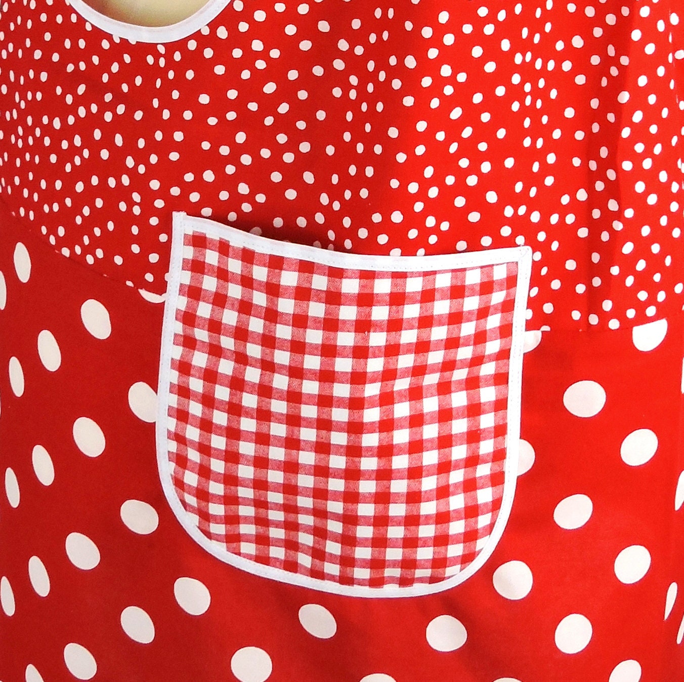 Red & White Scrapbuster Pinafore Apron: Designed to be easy to put on and take off using no ties, buttons, or fasteners of any kind. No gymnastics are required to don the apron! Simply slip the apron over your head like a t-shirt and slide your arms into the generous openings to put it on. The apron rests totally on the shoulders, placing no strain on the neck. Comfortable enough to wear all day long! Apron fully covers your clothing for protection while you are working around the house, but is completely split up the back (to the band at the top) to allow freedom of movement. Great care and attention are paid when I make these aprons-- there are no exposed seams or raw edges showing on my aprons! All seams are neatly enclosed for a sturdier and longer-lasting finished product. Armholes are bound with a coordinating bias binding for extra strength and durability. Extra-large patch pockets are so very handy for many purposes. The apron is gathered in front and back where it attaches to the top bands and fits many sizes due to its unique design. (Standard size apron is shown above on a SIZE 16 dress form.) Makes a great gift for the cooking/baking enthusiast on your gift list-- or for a very special treat for yourself! Many of my customers wear this apron as a pinafore over a t-shirt and leggings since they don't cook. I do not keep an inventory. This apron is not sewn until after order confirmation. The apron in photos is the original sample sewn to take listing photos. As with any handmade creation, fabric design placement will vary from apron to apron.