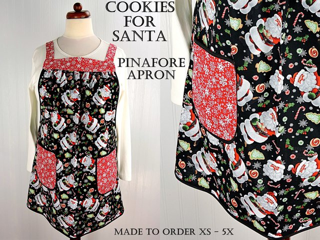 SHIPS FAST!!! The Pinafore Apron is designed specifically to be easy to put on and take off-- with no ties, buttons, or fasteners of any kind. No gymnastics are required to don the apron! Simply slip the apron over your head like a t-shirt and slide your arms into the generous openings to put it on. The apron rests totally on the shoulders, placing no strain on the neck. Comfortable enough to wear all day long! Apron fully covers your clothing for protection while you are working around the house, but is completely split up the back (to the band at the top) to allow freedom of movement. Armholes are bound with a coordinating bias binding for extra strength and durability. Extra-large patch pockets are so handy for many purposes. The apron is gathered in front and back where it attaches to the top bands and fits many sizes due to its unique design. Loose-fitting and very comfortable style to wear. Also great for expectant moms! (Standard size apron is shown above on a size 16 dress form.) Great care and attention are paid when I make these aprons-- no exposed seams or raw edges showing on my aprons! All seams are neatly enclosed for a sturdier and longer-lasting finished product. It makes a great gift for the cooking/baking enthusiast on your gift list-- or for a very special treat for yourself! *Several of my customers prefer to wear this style as a pinafore top over jeans or leggings!!! FUN!!! This is a one-of-a-kind apron that utilizes coordinating fabrics from Riley Blake Fabrics (Indian Summer Collection by Zoe Pearn.) I cannot make this apron in other sizes-- this is the only one ever-- but there are other aprons made in fabrics from this collection as seen in the last photo.