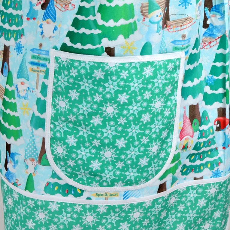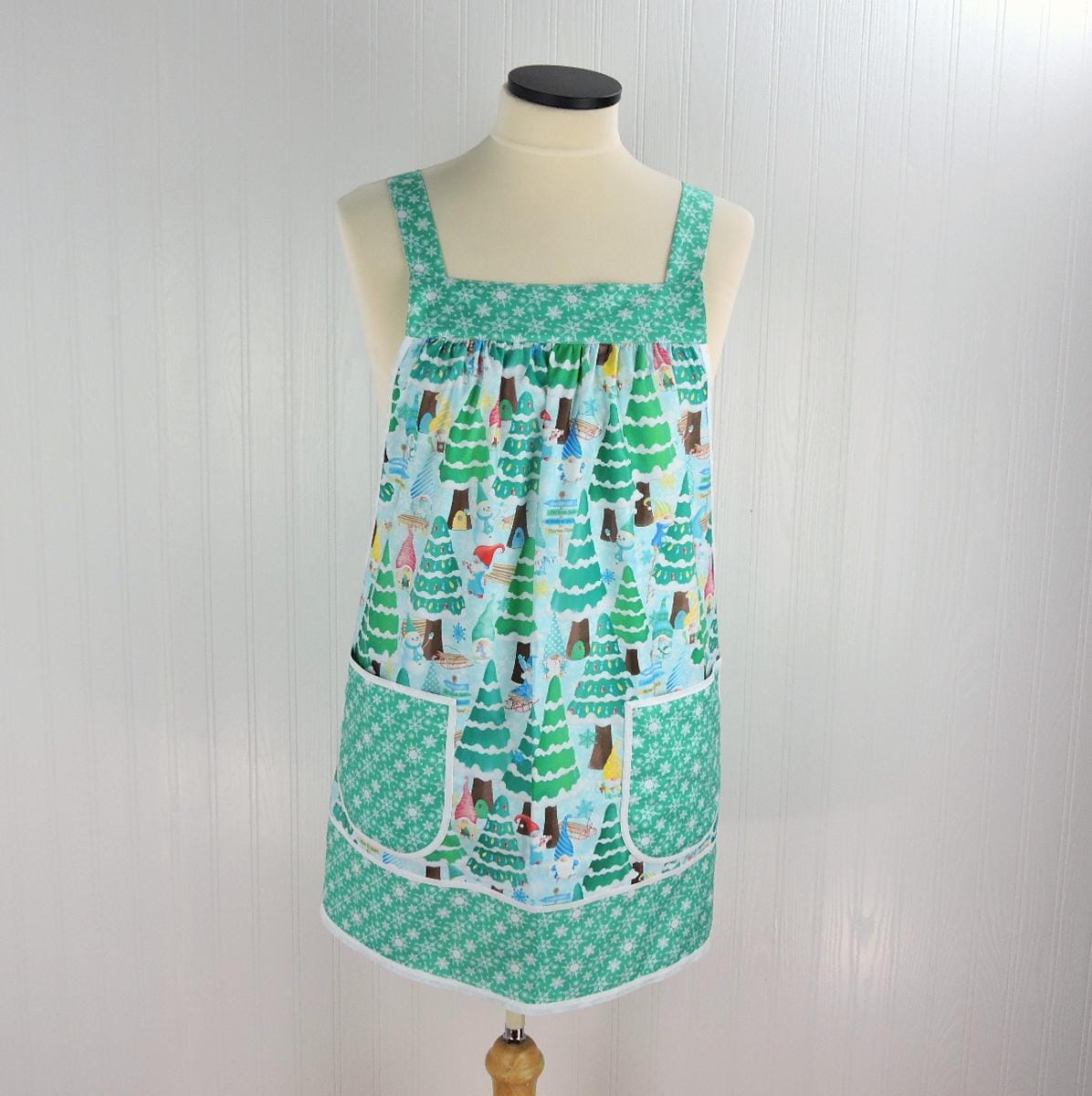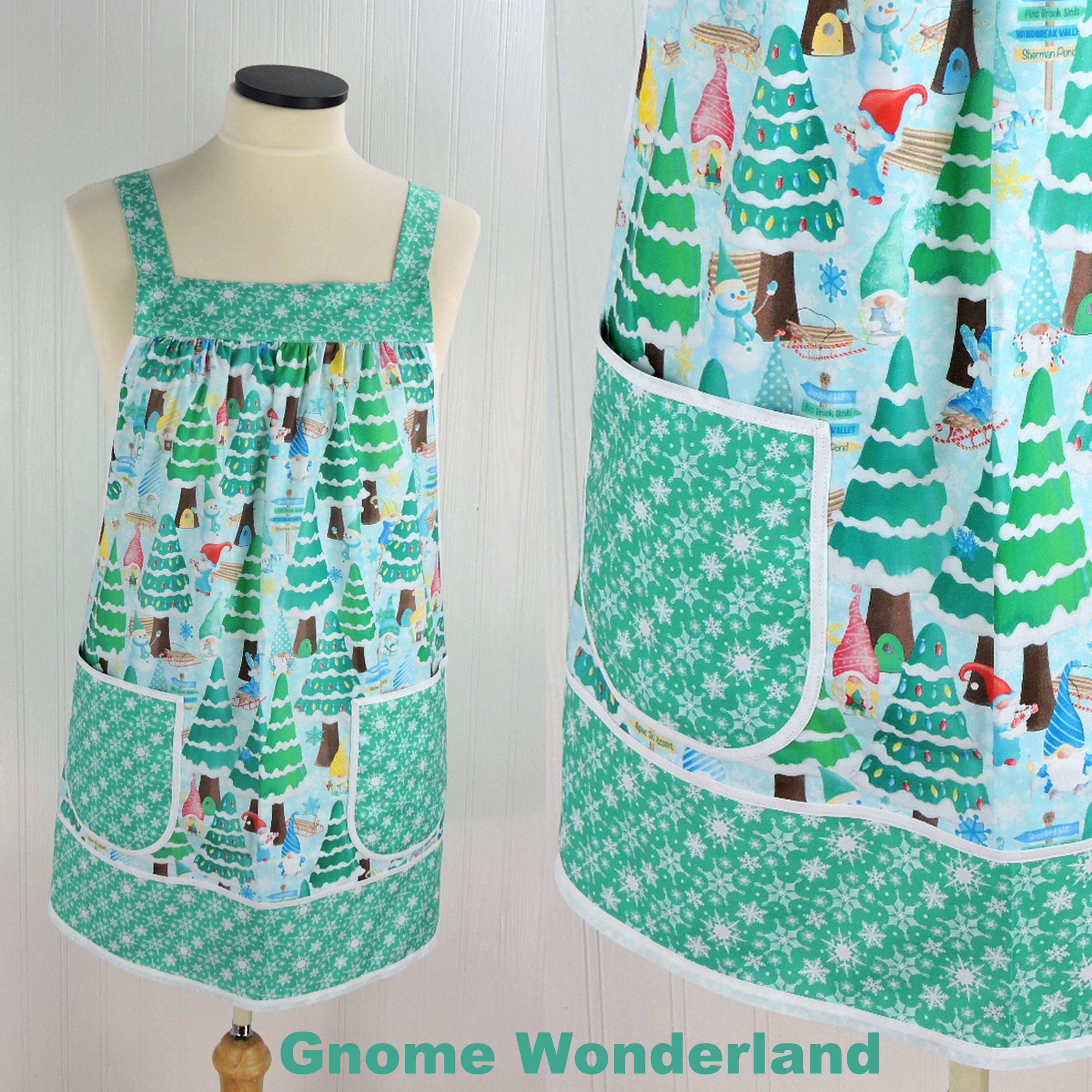 Lovely Christmas-themed Pinafore Apron features fabrics from the Benartex Gnome Wonderland collection. The apron is specially designed to be so easy to put on and take off using no ties, buttons, or fasteners of any kind. No gymnastics are required to don the apron! Simply slip the apron over your head like a t-shirt and slide your arms into the generous openings to put it on. The apron rests totally on the shoulders, placing no strain on the neck. Extremely comfortable for all-day wear! Apron fully covers your clothing for protection while you are working around the house, but is completely split up the back (to the band at the top) to allow freedom of movement. Armholes are bound with a coordinating bias binding for extra strength and durability. Extra-large patch pockets are so handy for many purposes. The apron is gathered in front and back, where it attaches at the top bands and fits many sizes due to its unique style-- certainly roomy enough for many plus sizes. Also great for expectant moms! (Standard size apron is shown above on a size 16 dress form.) Loose-fitting and very comfortable style to wear. Makes a great gift for the cooking/baking enthusiast on your gift list-- or for a very special treat for yourself! Great care and attention are paid when I make these aprons-- there are no exposed seams or raw edges showing on my aprons! All seams are neatly enclosed for a sturdier and longer-lasting finished product.
